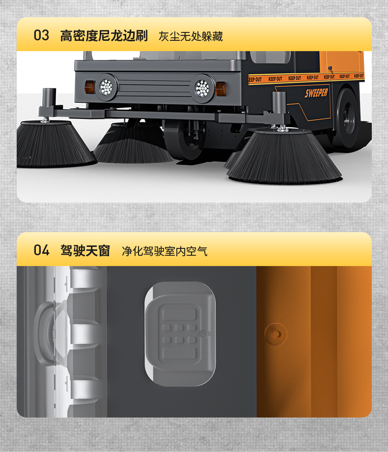 榮事達(dá)RS-CAR200 駕駛式掃地機(jī)配備了雙吸風(fēng)電機(jī),采用過(guò)載欠壓保護(hù)裝置,使用更加安全,駕駛式掃地機(jī)不僅配備了自主研發(fā)的邊刷電機(jī),而且還使用聚氨酯實(shí)心胎 和大容量垃圾箱,配件品質(zhì)高,也提升了使用的性能。 電動(dòng)掃地車(chē)廠家配置了吸塵濾芯,避免了掃地車(chē)操作過(guò)程中的清掃遺漏問(wèn)題,能夠?qū)崿F(xiàn)電動(dòng)振塵,全封閉的駕駛艙,實(shí)現(xiàn)了防雨防塵,滿足戶外道路、公園等場(chǎng)所的使用需求。
