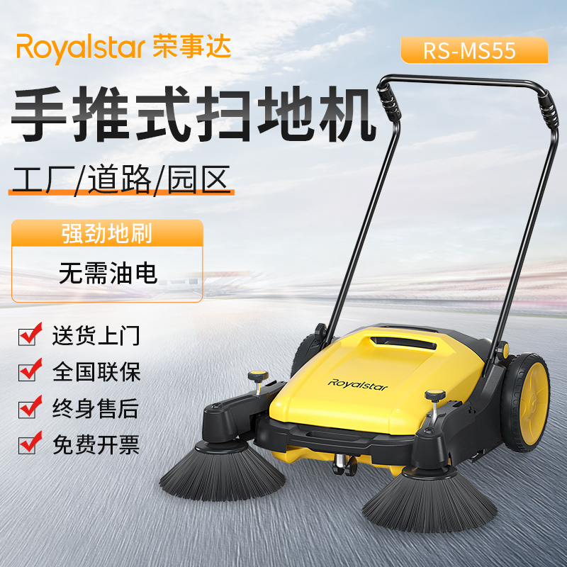 榮事達RS-MS55 手推式掃地機主要依靠滾刷、邊刷來完成清掃工作,結構相對簡單,操作方便快捷, 整機不需要任何電動助力,不用油、不用電,只需步行推動就能把垃圾輕松回收到垃圾箱,可以清掃地面粉塵、顆粒和落葉。榮事達RS-MS55 手推式掃地機設備型號包括55L普通款、55L工程塑料款、55L普通天窗款、70L工程塑料款、70L工程塑料天窗款 ,以及帶電瓶噴霧款,不同的款式在產品性能上存在著一定的差異,價格也不相同。