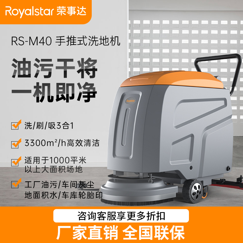 榮事達(dá)RS-M40 手推式洗地機(jī)采用了電動(dòng)助力的方式,操作起來更加省時(shí)省力,產(chǎn)品型號(hào)有拖線款、加液電瓶款和免維護(hù)電瓶...